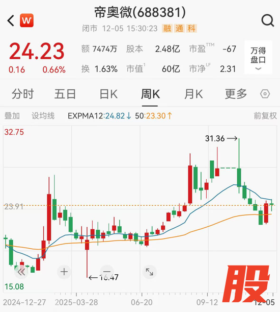 截至12月5日收盘,帝奥微报24.23元/股,总市值60亿元。