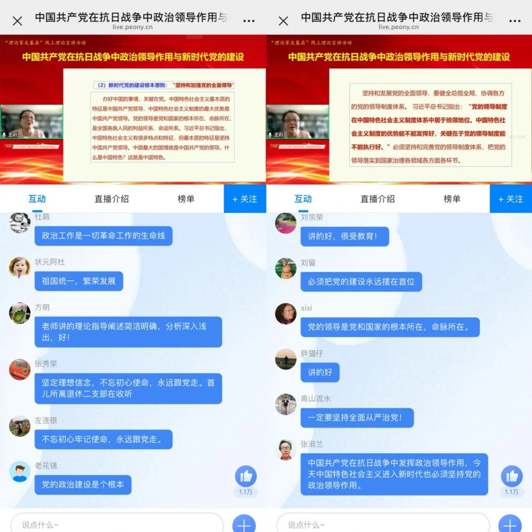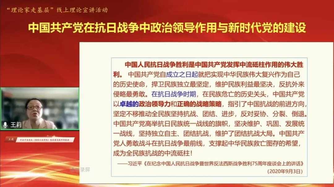 王莉教授结合多年理论研究,从“坚持党的政治领导是马克思主义政党建设的原则和传统”“中国共产党以强有力的政治领导成为全民族抗战中流砥”“新时代以政治建设为统领加强党的建设 不辱民族复兴使命”三方面,系统全面地讲解了中国共产党在抗日战争中政治领导作用与新时代党的建设。