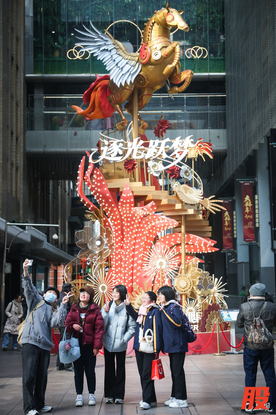 新世界城、新世界新丸中心、步行街金带、第一百货商业中心等核心点位,分布着7处美陈打卡点,别致的奔马造型搭配中国红元素,拍照出片率拉满,市民游客打卡之余,还能沾染新春好运。